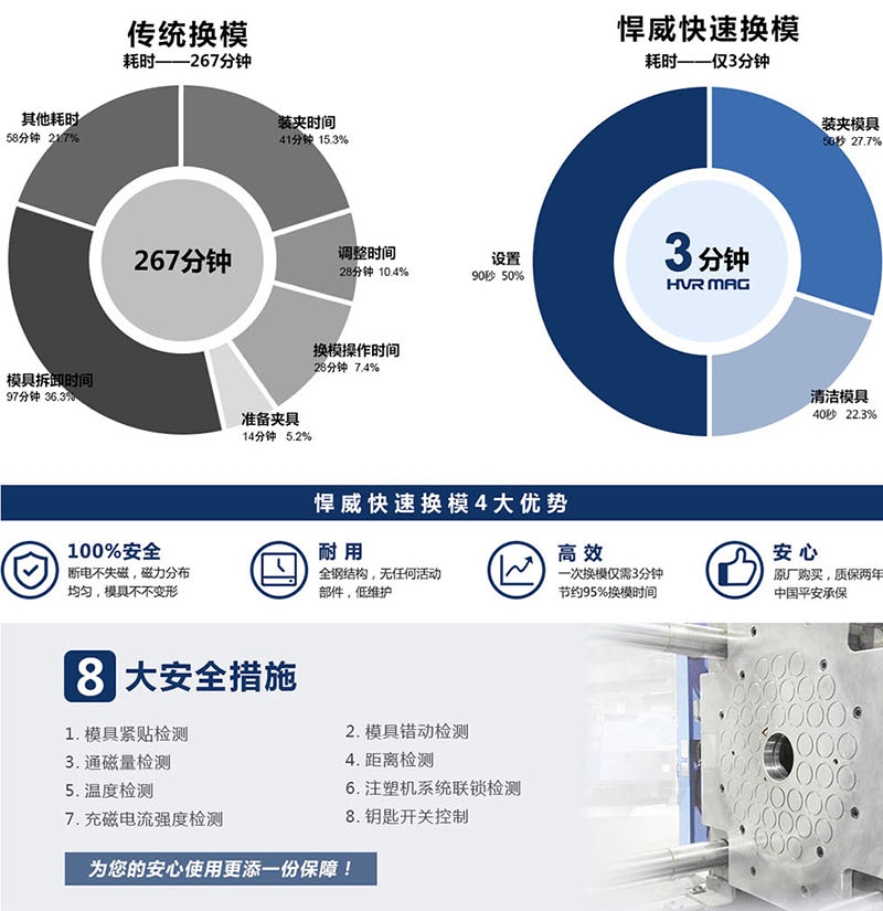 對(duì)比傳統(tǒng)的注塑生產(chǎn)線,使用磁力模板快速換模系統(tǒng)的優(yōu)勢(shì)有: