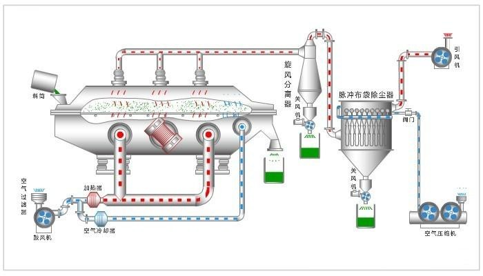 物料自進(jìn)料口進(jìn)入機(jī)內(nèi), 在振動力作用下, 物料沿水平方向拋擲向前連續(xù)運(yùn)動,熱風(fēng)向上穿過流化床同濕料換熱后, 濕空氣經(jīng)旋風(fēng)分離器除塵后由排風(fēng)口排出, 干燥物料由排料口排出。