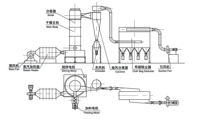 ● 干燥室內(nèi)周向氣速高,物料停留時(shí)間短,有效防止物料粘壁及熱敏性物料變質(zhì)現(xiàn)象,達(dá)到高效、快速、小設(shè)備、大生產(chǎn)。