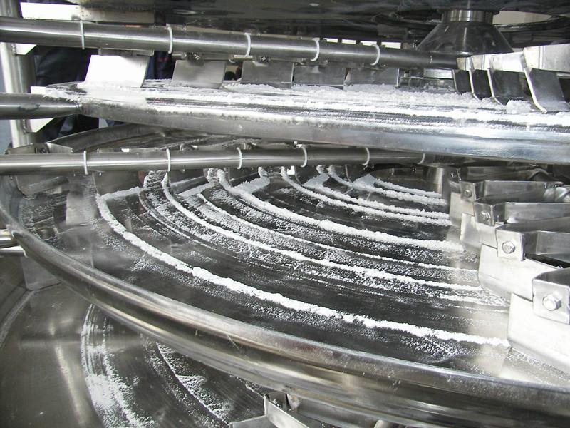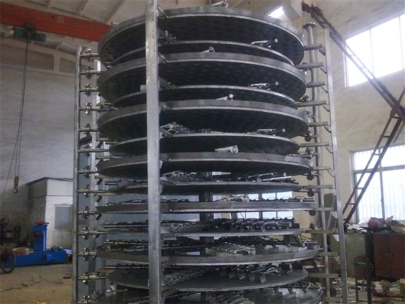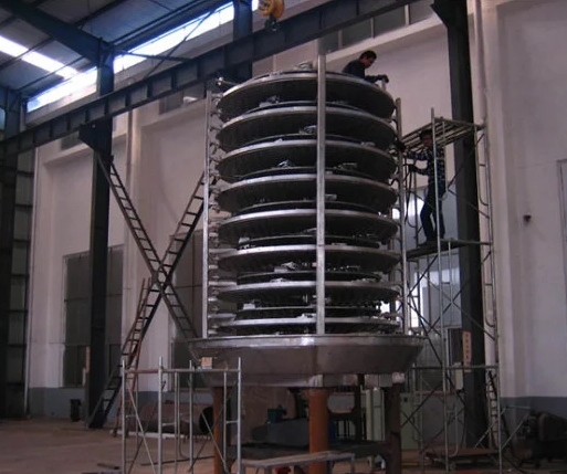 濕物料自加料器連續(xù)地加到干燥器上部第一層干燥盤上,帶有耙葉的耙臂作回轉(zhuǎn)運動使耙臂作回轉(zhuǎn)運動使耙葉連續(xù)地翻抄物料。物料沿指數(shù)螺旋線流過干燥盤表面,在小干燥盤上的物料被移送到外緣,并在外緣落到下方的大干燥盤外緣,在大干盤上物料向里移動并從中間落料口落如下一層小干燥盤中。大小干燥盤上下交替排列,物料得以連續(xù)地流過整個干燥器。中空的干燥盤內(nèi)通入加熱介質(zhì),加熱介質(zhì)形式有飽和蒸汽、熱水和導(dǎo)熱油,加熱介質(zhì)由干燥盤的一端進入,從另一端導(dǎo)出。已干物料從后一層干燥盤落到殼體的底層,后被耙葉移送到出料口排出。濕份從物料中逸出,由設(shè)在頂蓋上的排濕口排出,真空型盤式干燥器的濕氣由設(shè)在頂蓋上的真空泵口排出。從底層排出的干物料可直接包裝。通過配加翅片加熱器、溶劑回收冷凝器、袋式除塵器、干料返混機構(gòu)、引風(fēng)機等輔機,可提高其干燥的生產(chǎn)能力,干燥膏糊狀和熱敏性物 料,可方便地回收溶劑,并能進行熱解和反應(yīng)操作。